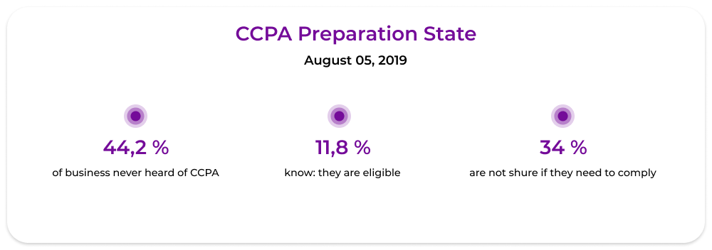 Basically, CCPA is very similar to the GDPR in its purpose to protect the fundamental privacy rights of users. However, having an example of how slowly companies adapted to GDPR, we can expect the same from CCPA. By August 05, 2019, only 11,8 % of companies knew their business would have to comply.