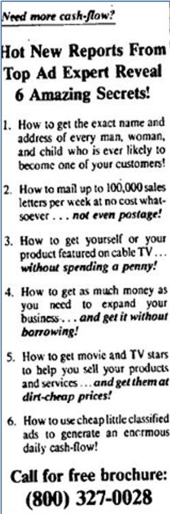 If you called the number you got an 8-page sales letter that fulfilled the promise of the 6 bullets, which are (in case you can’t read it):